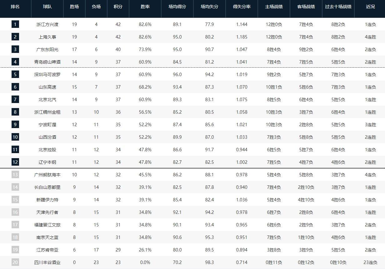 随着南京通过双加时126-123险胜深圳,本赛季CBA常规赛第一阶段的比赛落下帷幕。23轮战罢,广厦排名榜首,上海居次席,四川则惨遭23连败垫底。常规赛第二阶段的比赛将在农历新年之后开战。